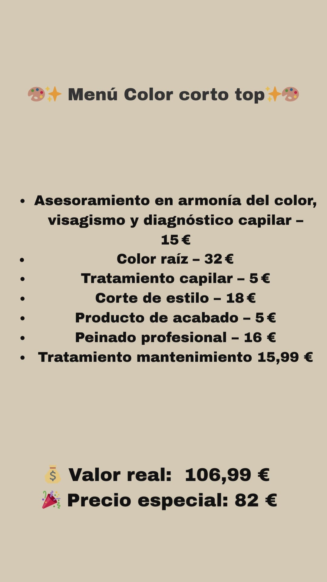 Transforma tu look con un servicio completo que realza tu imagen y cuida tu cabello. Este menú incluye asesoramiento en armonía del color, visagismo y diagnóstico capilar, junto con color de raíz, tratamiento personalizado, corte, producto de acabado y peinado profesional.